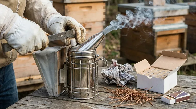 Iniciar um defumador de abelhas corretamente envolve uma abordagem simples e em camadas. Primeiro, acenda um material inicial de queima rápida, como jornal amassado ou papelão, no fundo da câmara de combustão do defumador. Use uma ferramenta de colmeia para empurrá-lo para baixo e, em seguida, adicione suavemente gravetos de queima mais lenta, como agulhas de pinheiro ou aparas de madeira, por cima. Por fim, coloque o seu combustível principal, comprima-o ligeiramente e use o fole para gerar uma fumaça branca, espessa e fria antes de fechar a tampa.
