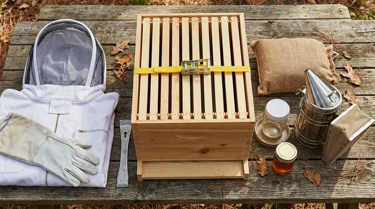 Para iniciar sua jornada na apicultura, você precisa de um conjunto fundamental de suprimentos que cubra três áreas distintas. Você deve adquirir uma colmeia completa para abrigar as abelhas, equipamentos de proteção individual para mantê-lo seguro e algumas ferramentas essenciais para manejar a colônia e realizar inspeções.
